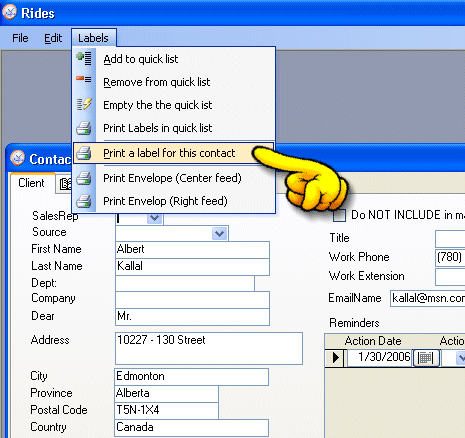 with this system, you can send one label to your printer. or, you can select 4, or 5 contacts, and then print them. this is useful if during the day you need to process 4 or 5 customers, and then send out material to that contact. perhaps you might even want to just print a label for a envelope to place tickets in.