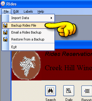 to backup a copy of the rides data file, you use the main menu, and go file->backup rides file